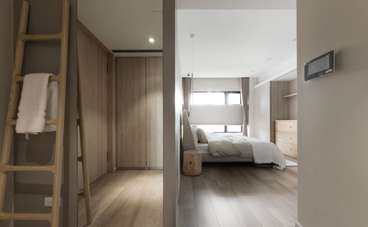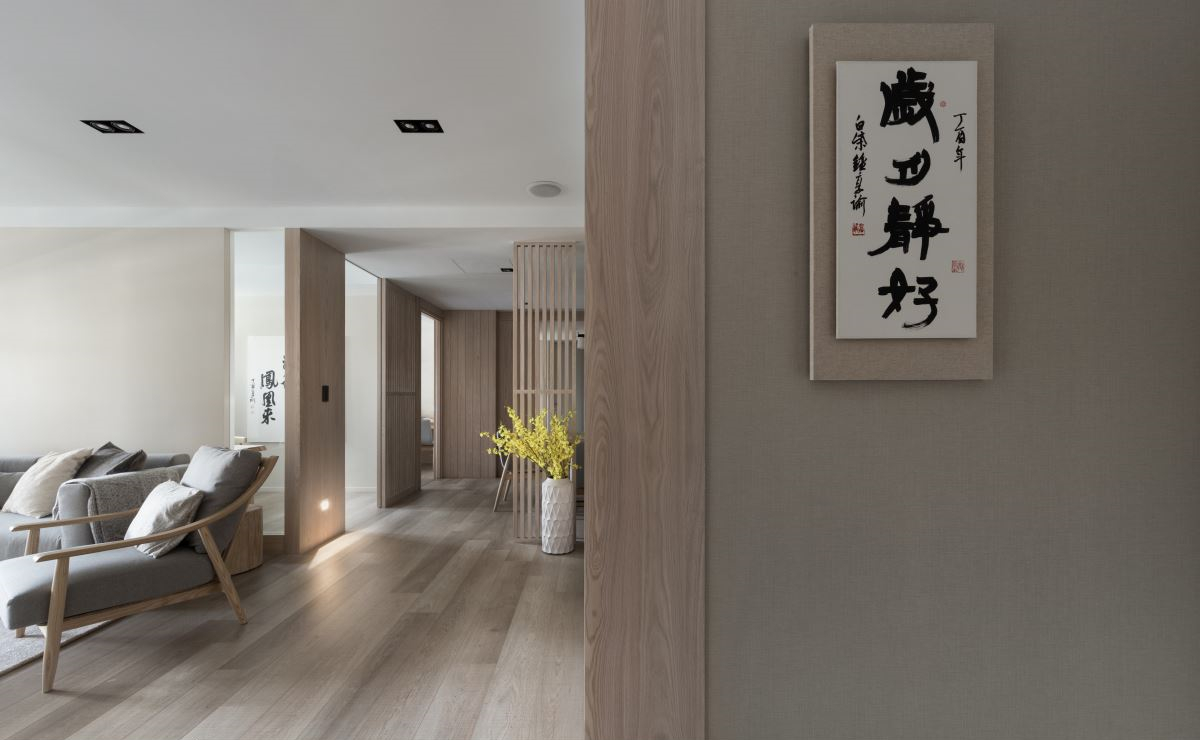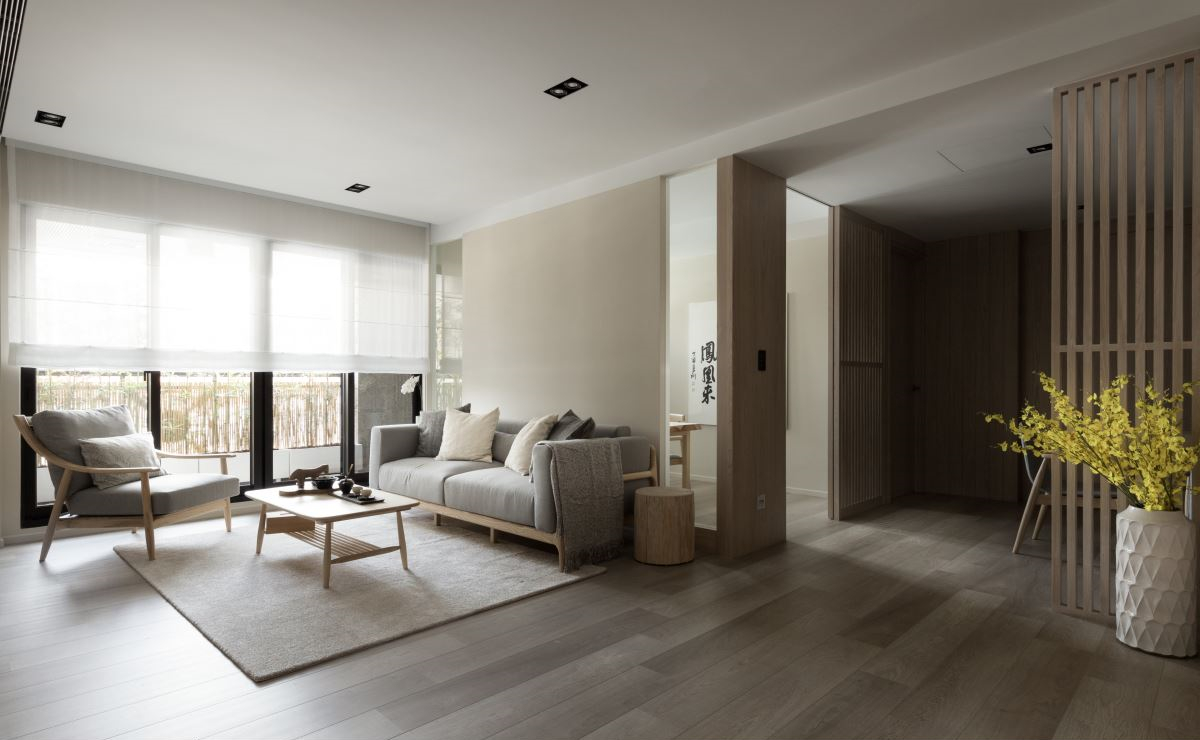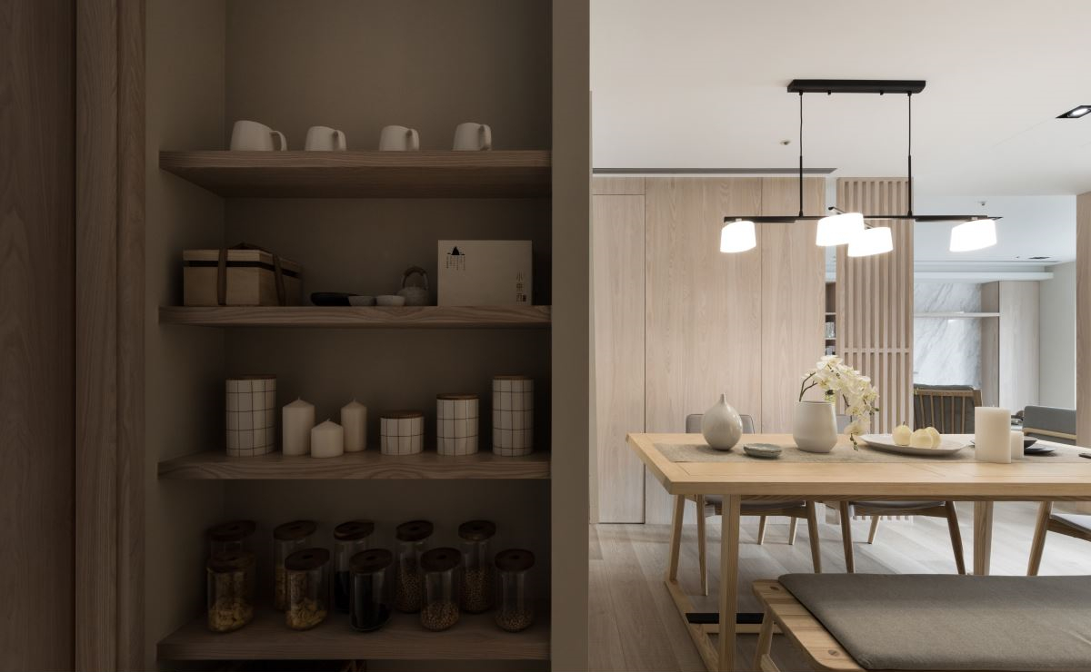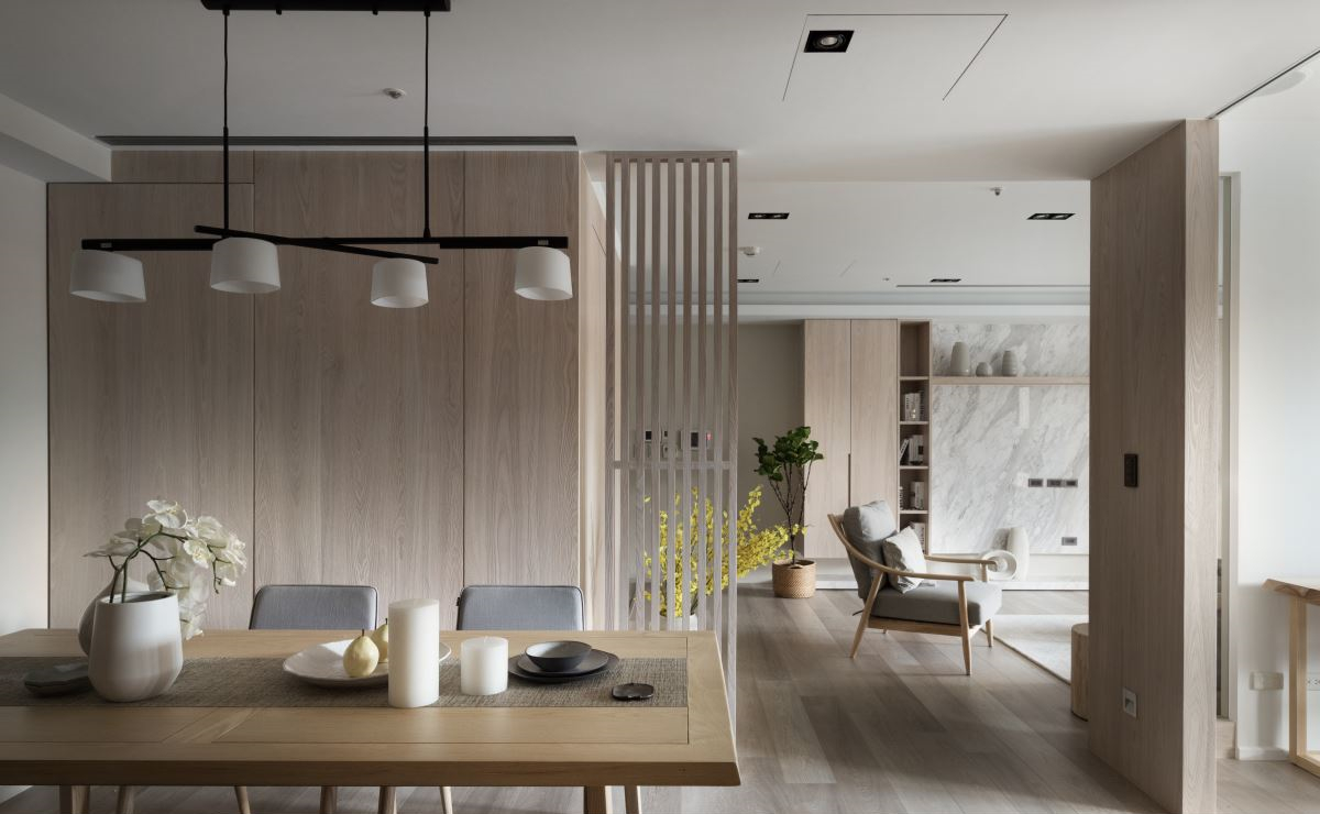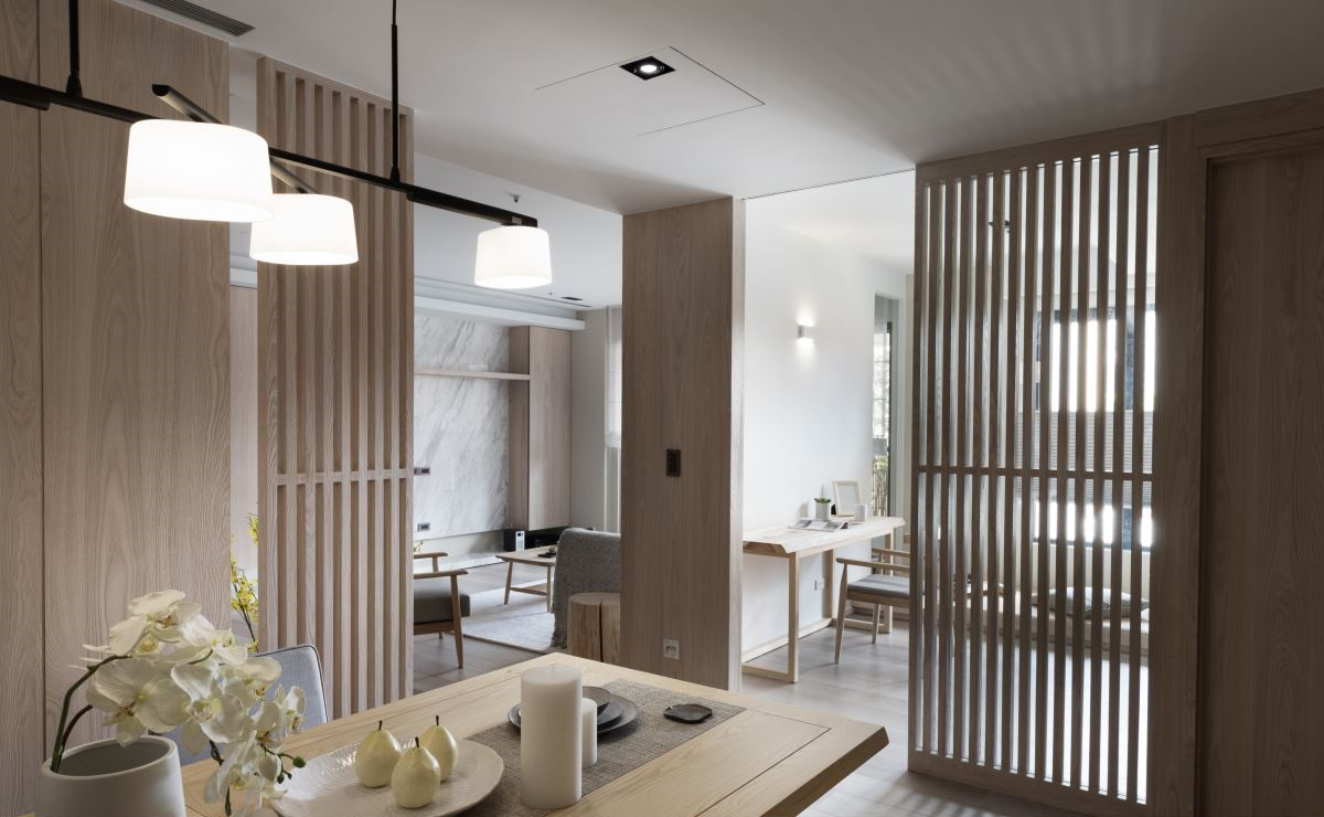 居宅通过大量「留白」,阐述开阔而具呼吸感的空间性,并以玻璃窗引导温煦阳光,补足空间的动人温度,同时赋予简约明亮的色调配置、优良的空间动线规划,在柜面、地板等处缀点木质元素,增添无压生活感;开放式的餐区则规划餐柜,以极简的收纳形式,网罗美感与机能,周边配置造型格栅,让空间之间可透光通风,使空间划分得更清晰轻盈;延伸至一旁,可来到多功能书房,以经典语汇表现经典的日式风格,藉由风琴帘让透入的阳光变得更柔和;卧房内,维持着简约的木质风格,沉淀着内敛稳妥的禅韵,平实不浮夸,却更显温度!