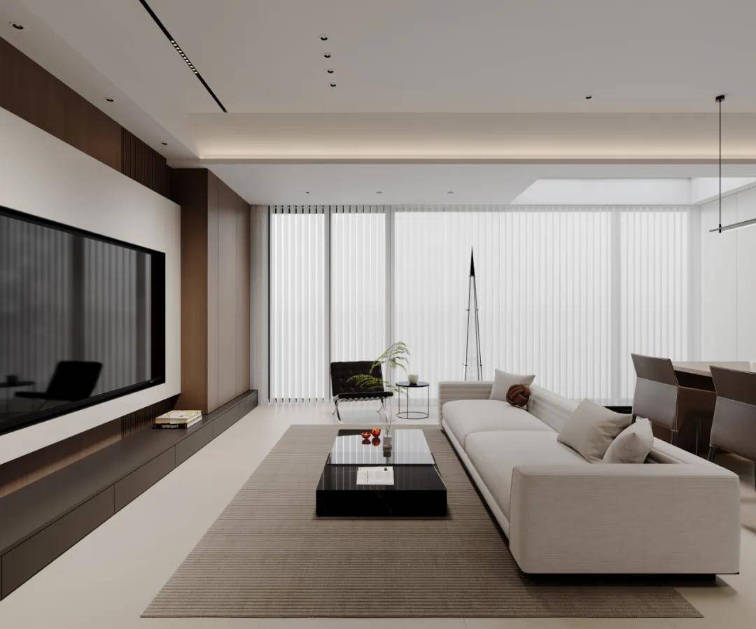 客厅选用了经典的白色作为电视背景墙的主色调,辅以咖啡色原木柜体,自然温润的木质元素与纯净的白色相得益彰,既展现了简约而不失温馨的居家氛围,又巧妙地增加了储物功能。中央的茶几也是亮眼的存在,大理石与钢化玻璃的拼接,为简奢而生,以规整而简洁的线条完美融入整体空间设计中,又确保了空间的通透性与流动性,为日常休闲提供了舒适的场所。