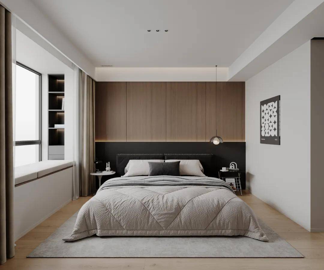 主卧的飘窗被精心设计成一个休闲的避风港,铺设上柔软的垫子,瞬间转变为一个温馨舒适的阅读或小憩角落。为了进一步提升这一空间的实用性,特意在飘窗旁的墙体上掏空,打造出精致的壁龛,不仅增添了空间的层次感,还巧妙地融入了收纳功能,让每一件小物件都能找到它的归属。