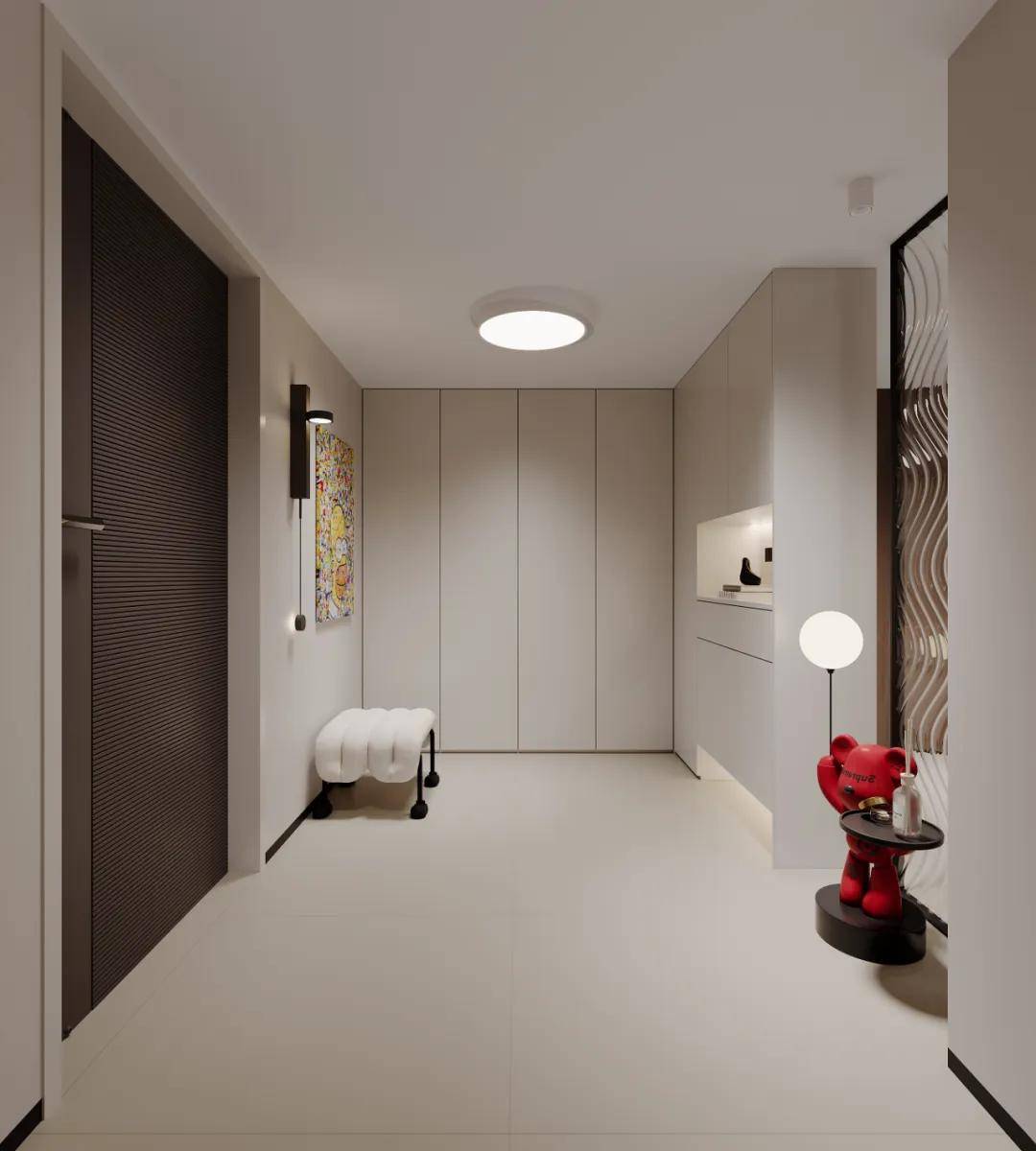 一间独立的衣帽间,依旧不能满足业主对储物空间的需求。于是主卧室的宽度优势被充分利用,床尾区域被精心规划为一整排衣柜的所在。这排衣柜不仅满足了日常换洗衣物的便捷存放需求,还通过其大容量设计,有效分担了衣帽间的收纳压力,使得四季更迭的衣物都能得到妥善安置,衣帽间则更加专注于存放换季衣物,整体收纳体系既高效又井然有序。
