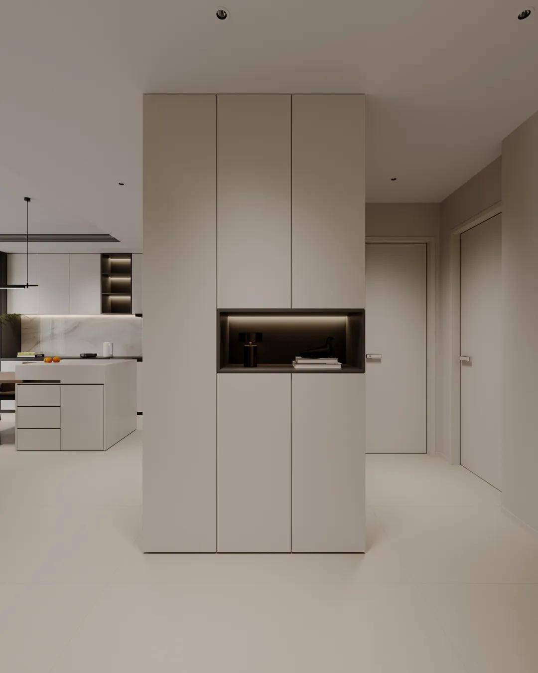 2.原楼梯正对的墙体拆掉改做收纳柜,连着厨房厨柜一体,整体性更好;
