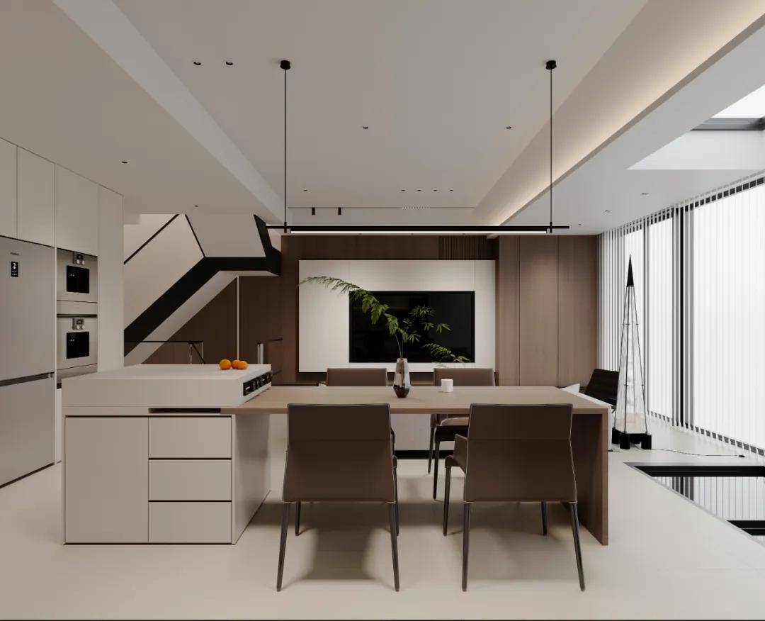 下叠联排别墅,得天独厚的布局,上层静谧雅致,下层闲适惬意,米白与咖色的木饰面交织出温暖的基调,如同午后的一缕阳光,温柔而不失力量;局部黑色的点缀,低调中彰显不凡品味。