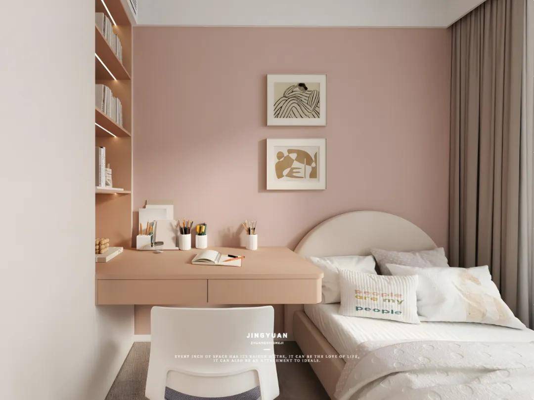 有限空间里规划了休息区和学习区。靠窗的位置布置了一张单人床,不放床头柜,左侧墙壁上设计了嵌入式书架,充分利用了垂直空间进行书籍和其他物品的收纳,悬浮书桌,学习区与休息区融合。