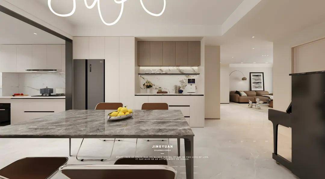 沿着斗柜墙面步入,来到开放式餐厅。一方长桌就在餐厅的中央。大理石桌面,合金桌腿,稳固宽敞。餐边柜占整面墙,一半一门到顶,内嵌冰箱;另一半上方原木吊柜,下方大理石台面+组合柜,中空作为操作台方便小型家电使用。