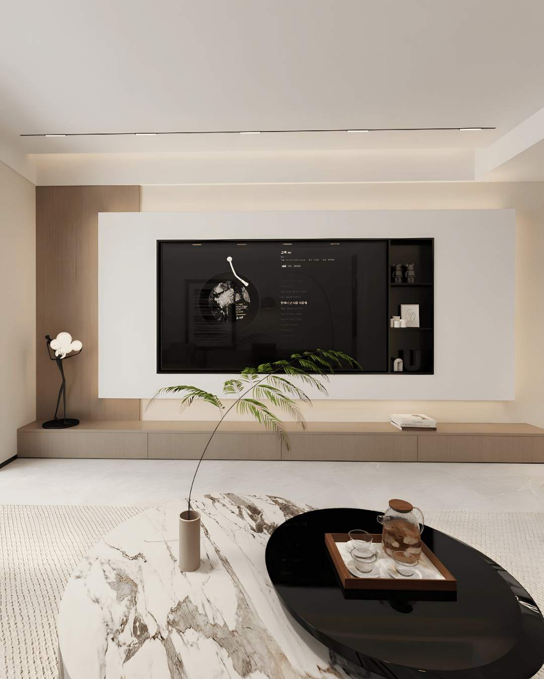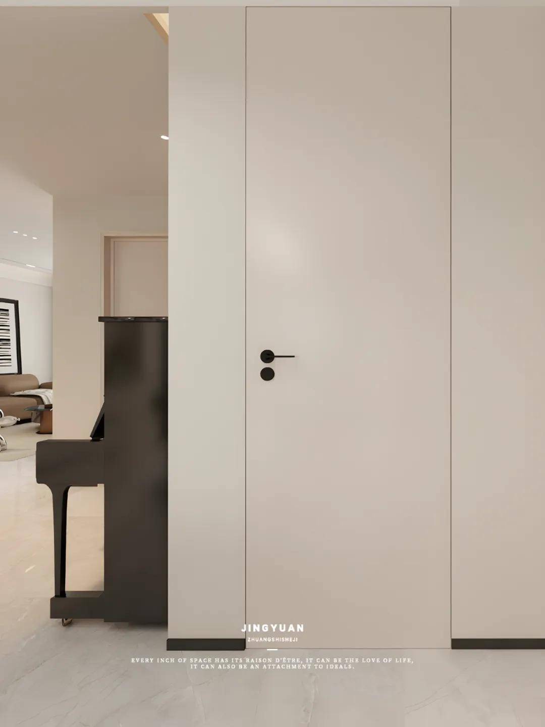 针对无独立玄关的空间,通过定制斗柜实现储物与过渡功能。客厅保持原始结构,去除阳台隔门增强通透感。钢琴置于入口正对面,成为视觉焦点与玄关元素,同时不影响其他空间使用。钢琴后小空间采用同色无框门,既美观又实用,作为储藏室使用,完美融入整体设计。