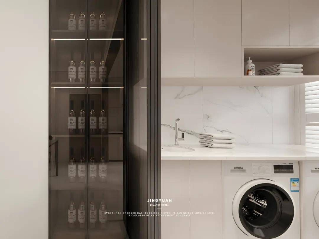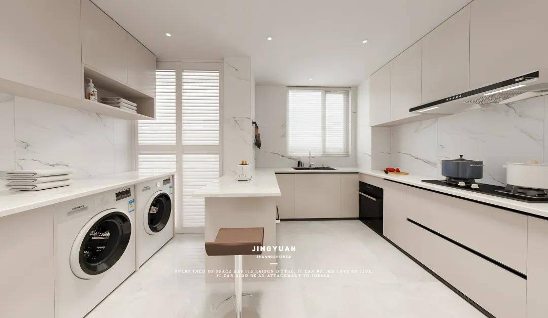 将洗衣房与厨房之间的厚重墙去掉,取而代之的是一扇四联动移门,轻轻一滑,便让两个空间无缝衔接。厨房因此获得了前所未有的开阔感,操作台面的延伸让烹饪成为享受;而洗衣房,也不再是角落里的孤独存在,它融入了家庭的日常,变得更加亲切与便捷。