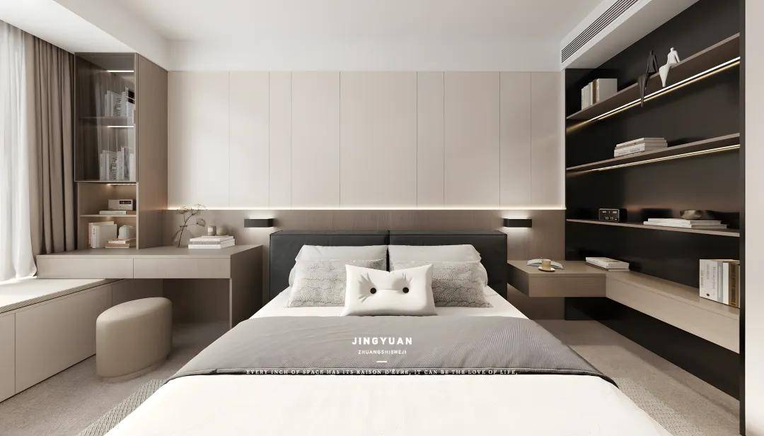 主卧,属于夫妇俩的空间。利用了原本空旷的过道空间,在床尾打造的一排定制衣柜,解决了衣物收纳的难题。而窗边的木柜假飘窗设计,更是为忙碌的生活增添了一抹闲适与惬意,每当夕阳西下,夫妇俩便能在此共享静谧时光。