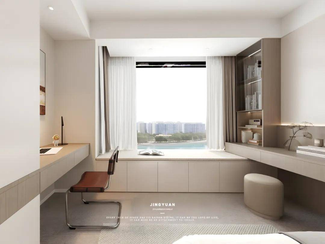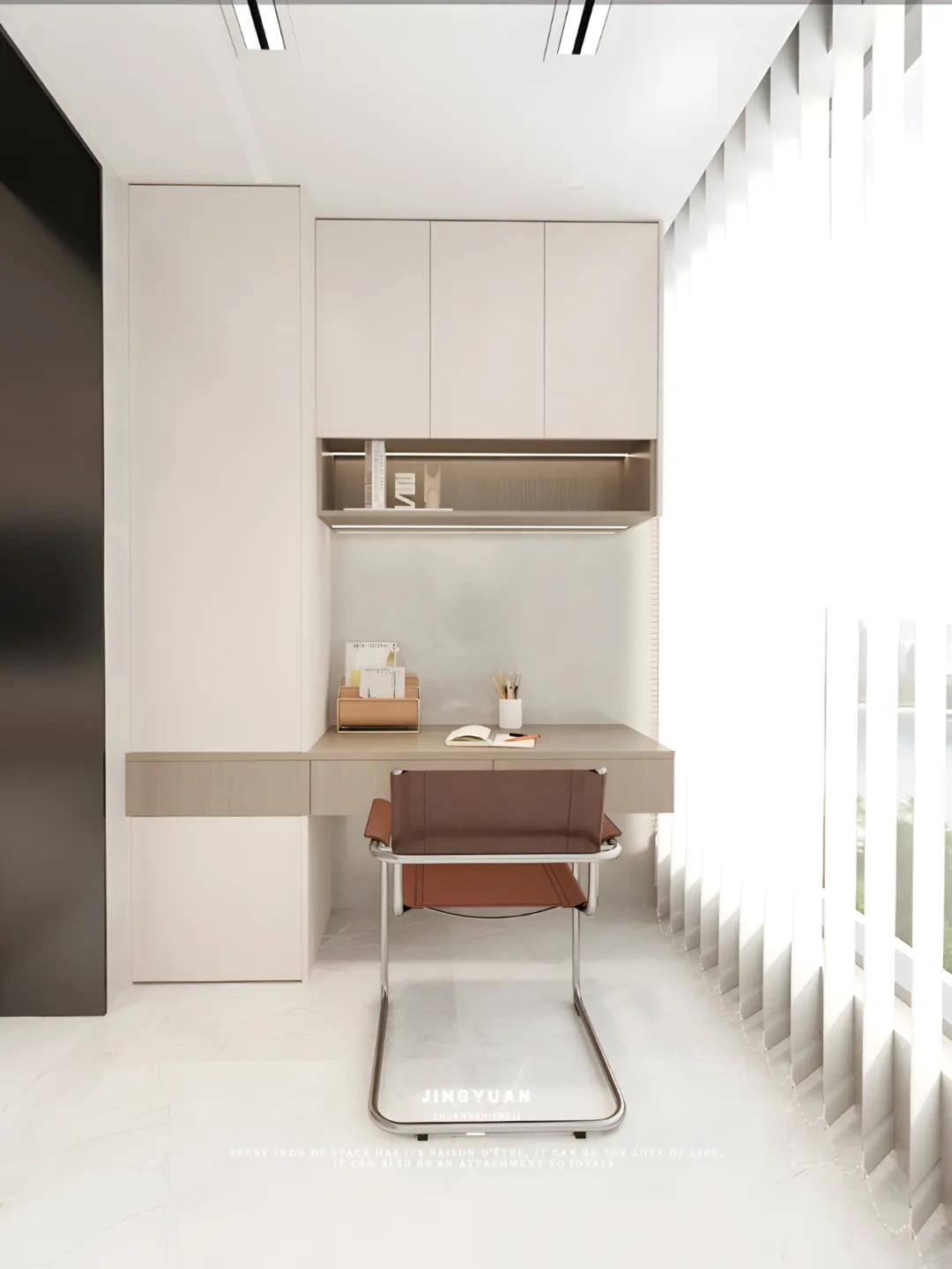 主卧为进一步优化空间布局,移除主卧走道区域的隔墙,打造出一面整体而流畅的衣柜墙,衣柜延伸,无缝衔接至一张悬浮式书桌,搭配一张时尚的悬臂椅,既节省空间又不失功能性,提供一个静谧而高效的私人办公或阅读角落。