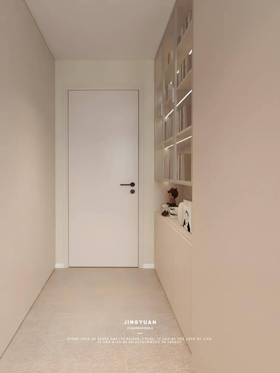 次卧与餐厅相邻的墙体向餐厅方向推移,嵌入了一组衣柜,极大地拓宽了次卧的实用空间,优化储物功能。在入门左侧的墙面打造定制柜,中空位置的台面放置小物件。上方书架充分利用了垂直空间,增加了储物与展示的功能性,还通过玻璃门营造出一种轻盈通透的视觉效果。