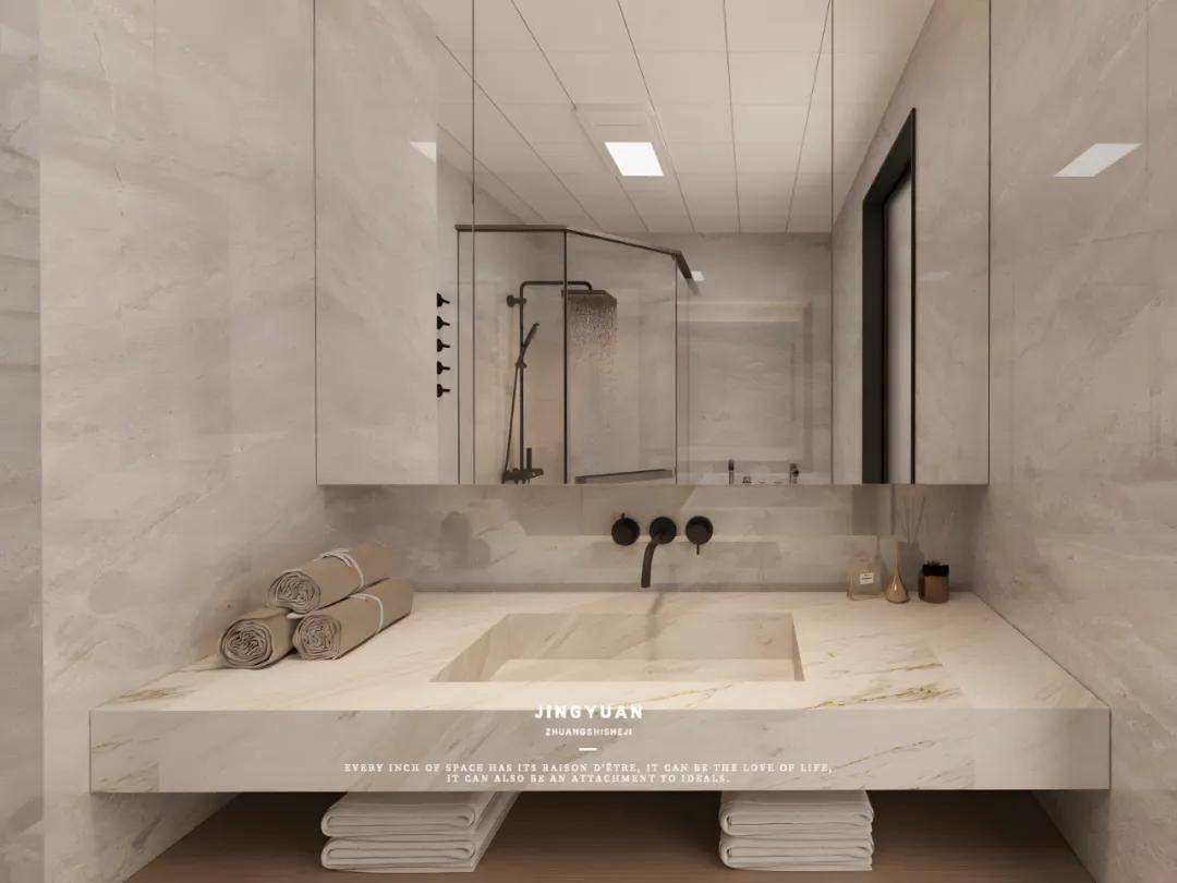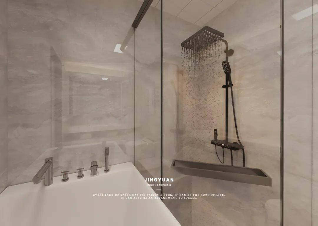 主卫墙面和地面选用的大理石纹理瓷砖,不仅美观大方,还具有良好的防滑和耐用性。在浴室区域,在淋浴区旁装方形浴缸,在宁静的夜晚,感受温润的水波轻抚肌肤。